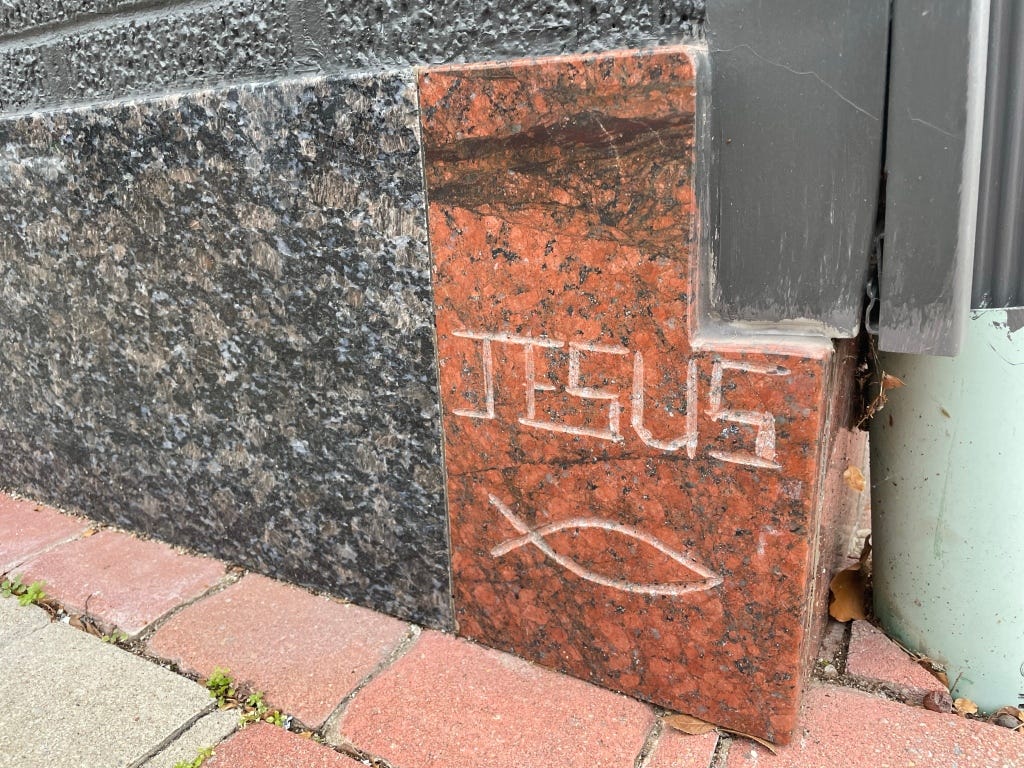 A few weeks ago, I was walking Scout in our little community and I saw something that maybe has been there a long time or maybe its new. But it is at the base of a wall of one of the older buildings in the “downtown” area. It is this simple carving of the Christian symbol of the fish and the word “Jesus.” That’s my foundation and it is the life and practice and teachings of Jesus that point me to the way to try to live and the foundation upon which I try to build my life.