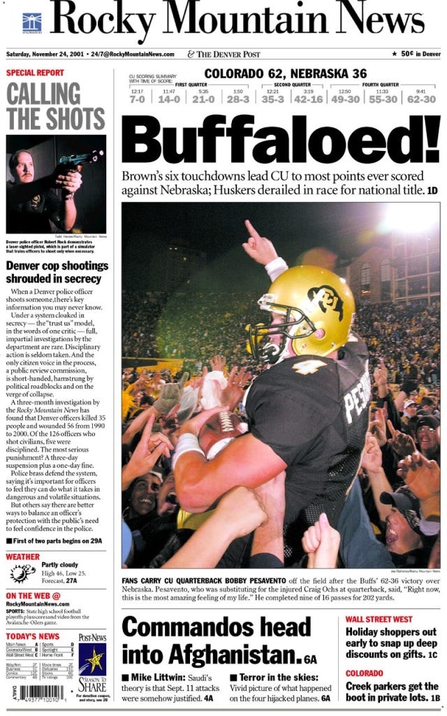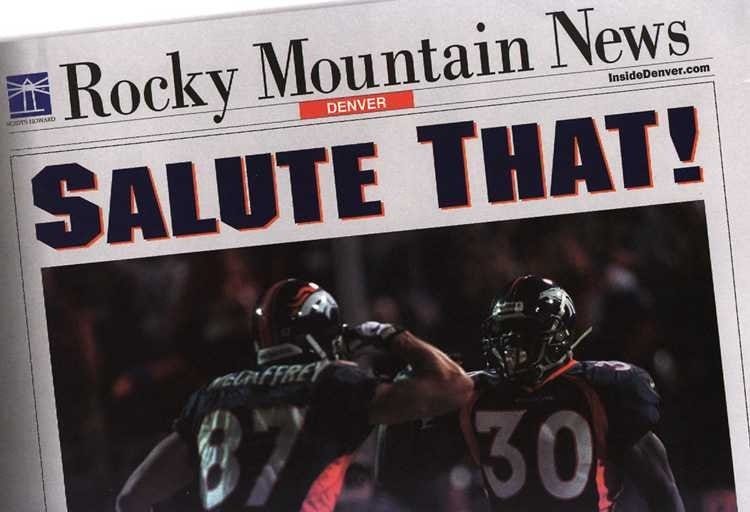 And so it was with sadness that I read today (online of course) that tomorrow will be the last issue of the RMN to be published. This will leave Denver with only one daily instead of the two (the RMN and the Denver Post) that were so much a part of my growing up. I remember the first time that the Broncos went to the Super Bowl with John Elway. They beat Cleveland in OT when Elway led the Broncos on The Drive and Rich Karlis kicked the game winner to send the Broncos to the Super Bowl against the New York Giants. The next morning, I handled that newspaper with careful hands as I felt like I was reading a collector's item. Other sports moments and world moments gave the same feeling and sense.