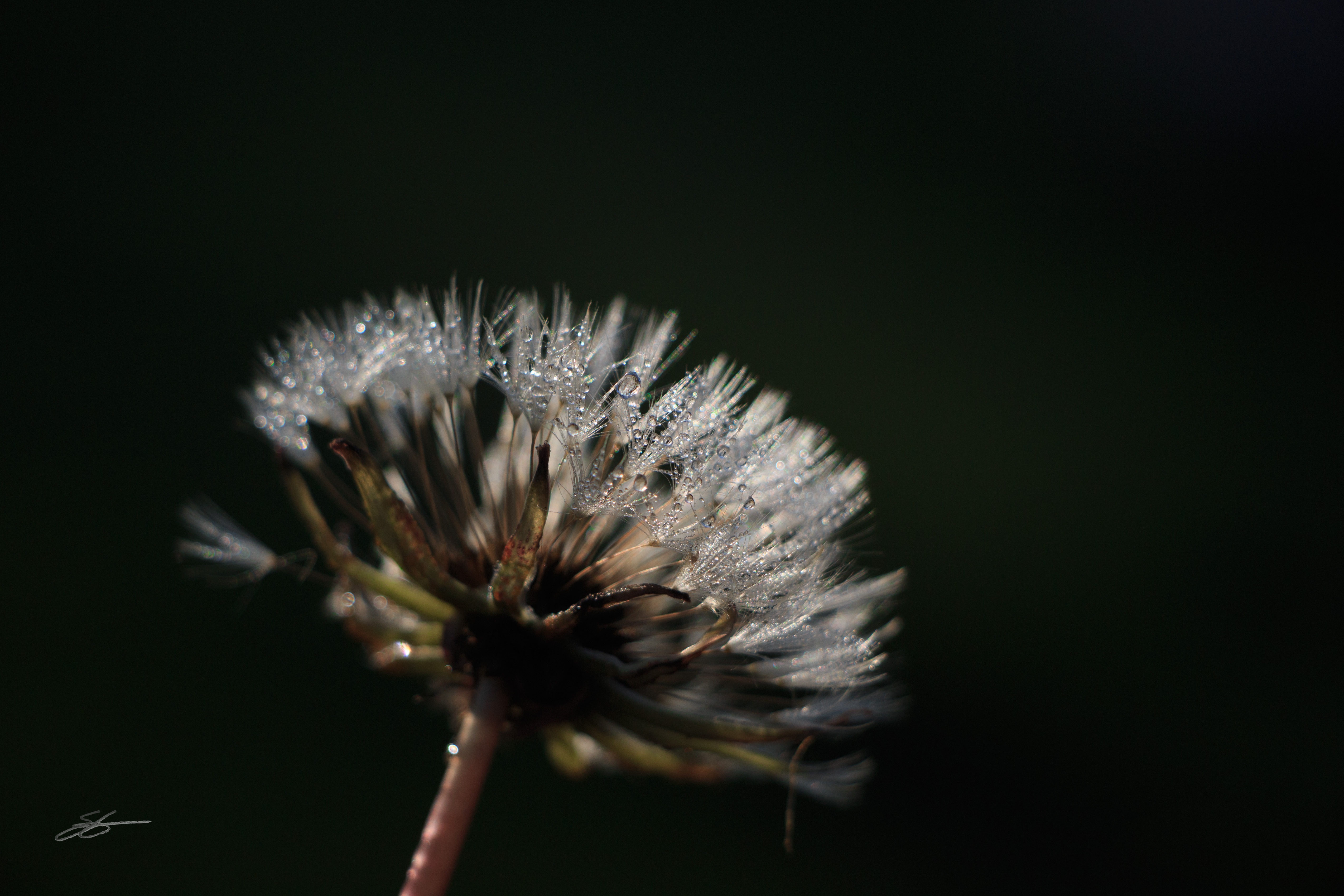 I love "happy accidents." Thanks Bob Ross. I took this yesterday morning on an early walk and didn't intend for the background to turn out as it did. The background was against a bunch of green grass and plants and it turned out with this dark background with just the tiniest hint of green. But the dew and some of the dandelion is perfectly sharp. Yea for happy accidents.