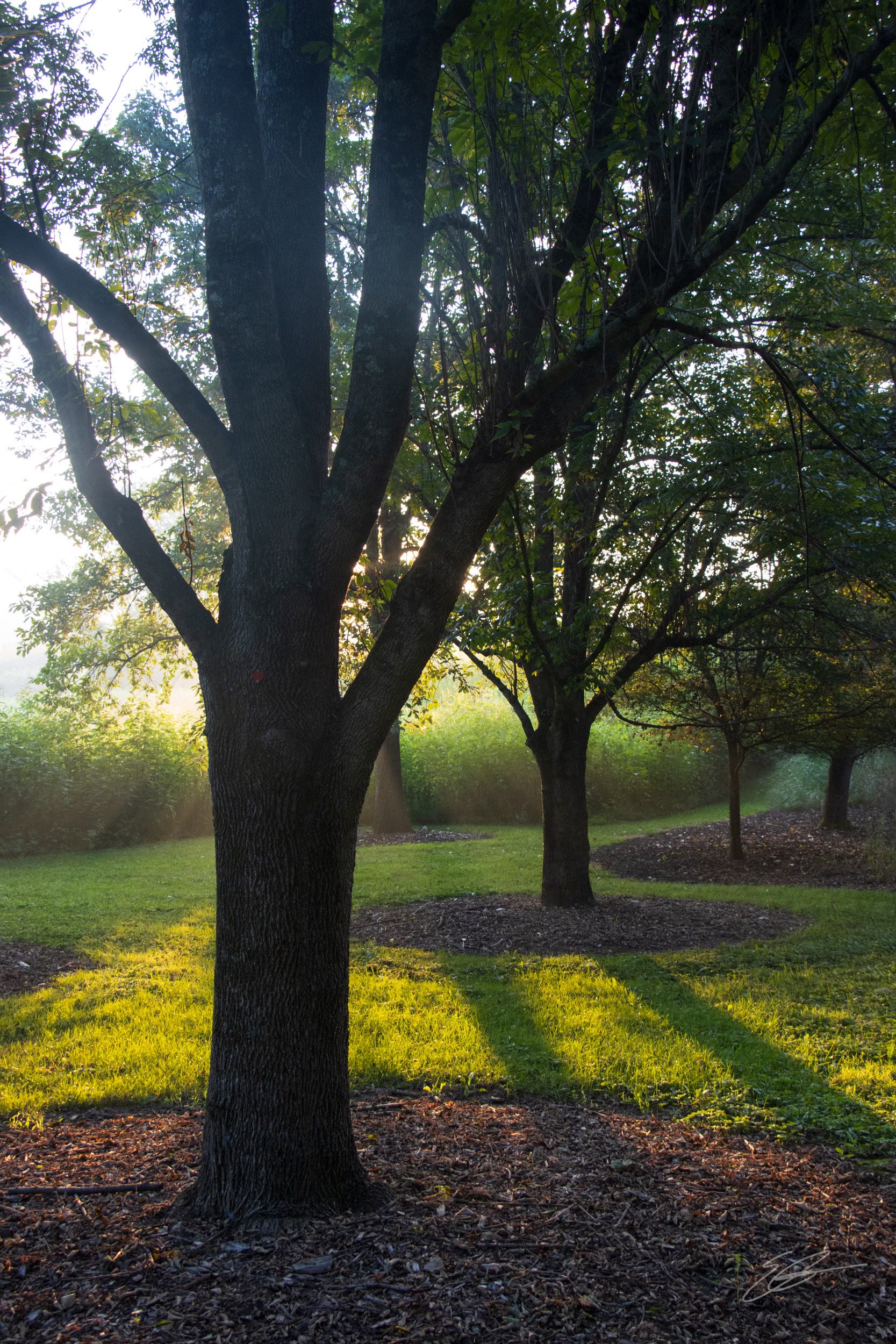 I photographed this scene because I loved the shadows on the grass and the illuminated haze in the background. What I didn’t see at the moment was the arched doorway made by the framing of the trees and the mulch on the ground. Do you see it?
