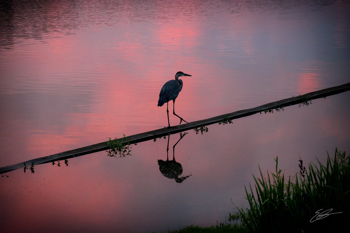 I was so drawn in by the perfect reflection of the brief moments of color in the sky, the gentleness and steadiness of the heron, and the stunningly unique look of the glassy water on either side. The phrase that came to me as I watched this was “walking along eternity.”