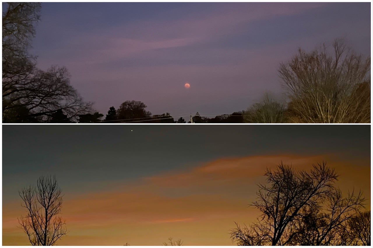 I was out very early this morning as I had volunteered to pass out sample ballots at a local polling place and so I was able to take in the lunar eclipse. It was beautiful. But it was also really unique for me because as I looked at the eclipsed moon setting in the west, the morning sun was rising in the east. To the west were the blue and purples of the sunrise mixed with the crimson of the moon. To the east the orange, yellow, and red of the sunrise. And it took a while as I was walking to find a place where I could see both at the same time. As I stood there in our local middle school parking lot, I found myself lamenting. I was lamenting the fact that it feels like we cannot be in places in the middle like this right now. We either have to be in the blue or the red, the liberal or conservative, democrat or republican. I am not writing here with a grand solution as much as a simple lament that we seemingly have lost this place in between...a place where we can hold both together...And in a sense it was fitting that it took a while to find that place to see both clearly.