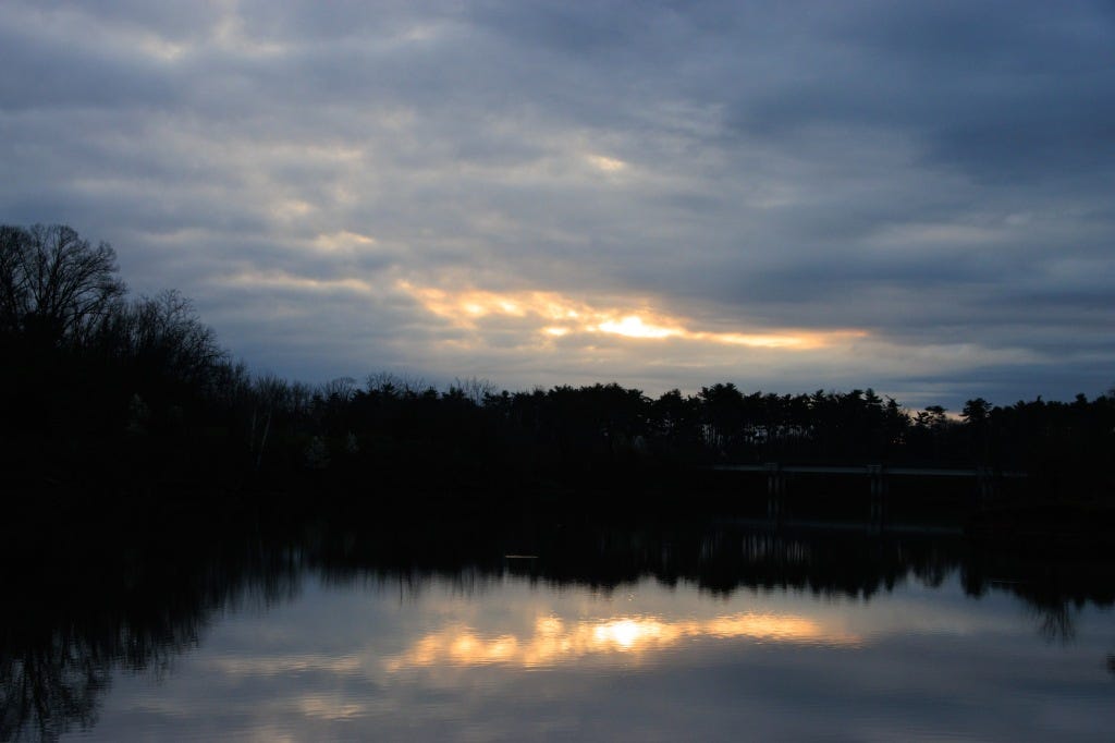 Before Scout and I went out this morning, I thought it was supposed to be a clear-ish morning and that there would be a chance of a really colorful sunrise. Unfortunately, as we got to the lake, everything was clouded over. I was disappointed but that’s how life is sometimes. However, as we got about halfway through, we started walking south so the western sky was on our left. I looked over and there was this small break in the clouds through which the rising sun was shining out. It wasn’t for long but it sure was beautiful.