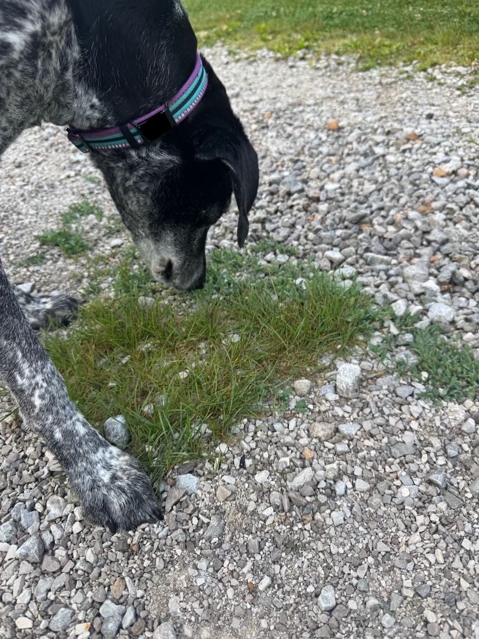 So I look at that and see simply a patch of rogue grass growing in the middle of a gravel path. Even if I bent down and stuck my nose in the grass, I might only smell some hint of the grass smell but that would likely be about it. As I looked at where Scout was sniffing, I didn’t see anything. But she was locked in and was on some scent and was sniffing so much at it that I could hear her when I was standing up. She does a thing as well where she kind of snorts (blowing out) air when she’s sniffing like that - I think it is to get the scents “kicked up” a bit.