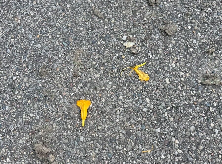 And then this - same walk as the “sniff” one with Scout. These two flowers that were on the path - got me thinking back to the purple ones from the other day. What’s the story behind these? Maybe not a wedding or something like that but instead something else? Maybe some had been given a bouquet of flowers and a few fell?