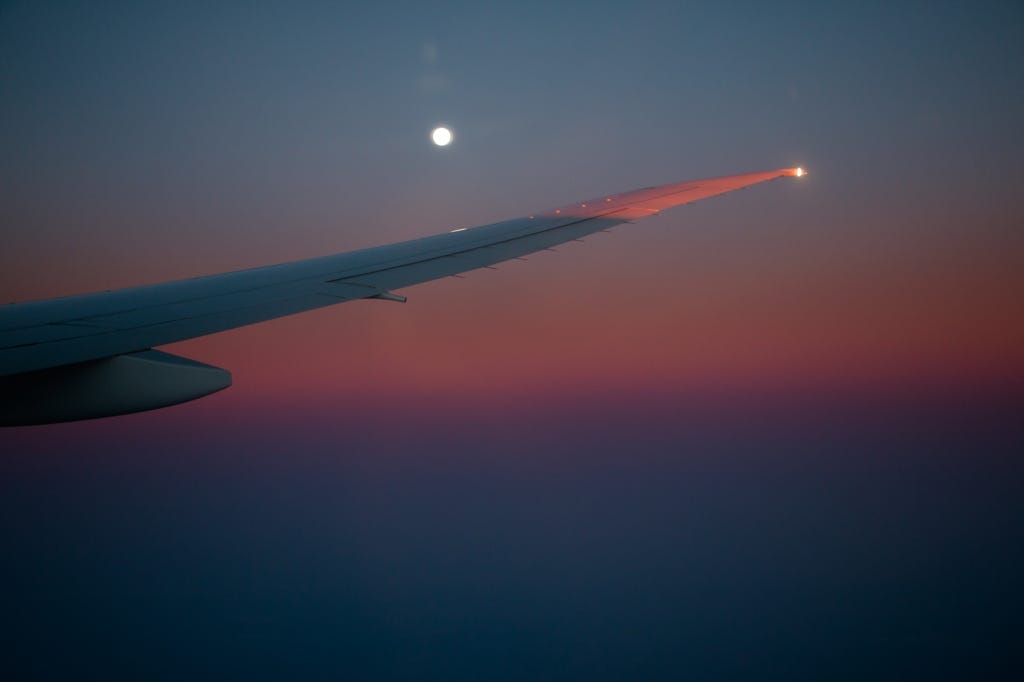 First, this picture was taken after we reached our altitude after departing Dallas for Doha on the first leg of the big journey. While we had beautiful colors in the sky on our side of the plane (including the full moon), we didn’t get the full breadth of the sunset that was seen out the other side of the plane.