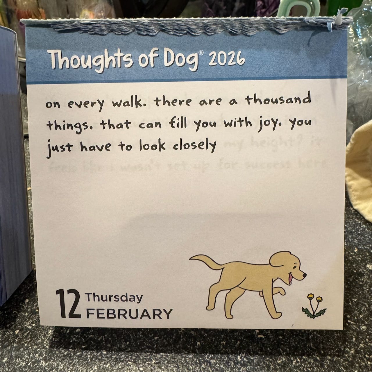 Actually one of Scout and one from our daily Thoughts of Dog calendar. I texted the Scout photo to our family group with the message “who knew that Scout was an elf.” This is a bit of an obscure reference to a scene in the Fellowship of the Rings film for those who aren’t quite sure of the connection.