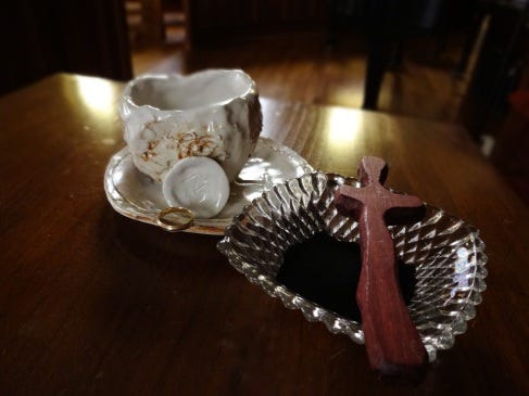 The picture I took today tries to capture some of these different pieces. I have the ashes from tonight's Ash Wednesday service as a reminder of where I came from (and where I'll eventually be going), I have the cross to represent that I am a follower of Jesus, I have my ring given to me nearly 13 years ago by my wonderful wife, and I have three pieces created by each of our beautiful children representing my role as a father. All these taken in the sanctuary of the congregation I serve.