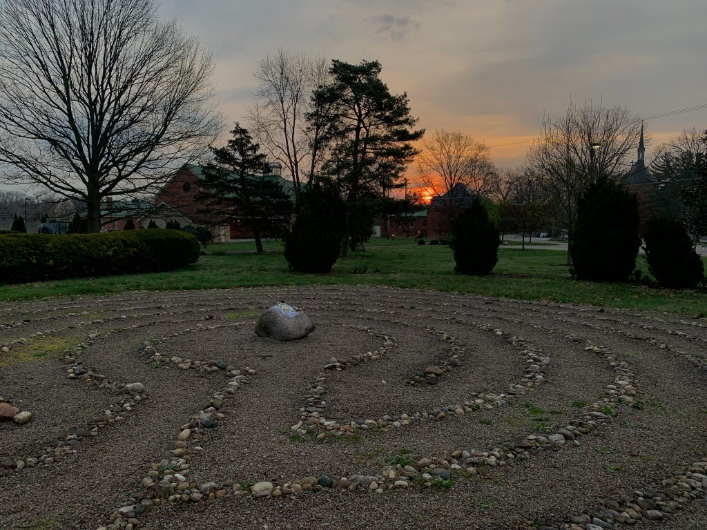 Walking the labyrinth this morning, I was not only seeking to be attentive to the moment and the time I was in, but really to what I was hearing as I walked. The birds chirping in the early morning, the sound of the gentlest of breezes through the trees, a wind chime somewhere nearby, cars passing on the road, but most of all the crunch of my shoes on the gravel as I looped and wove through the prayerful path.