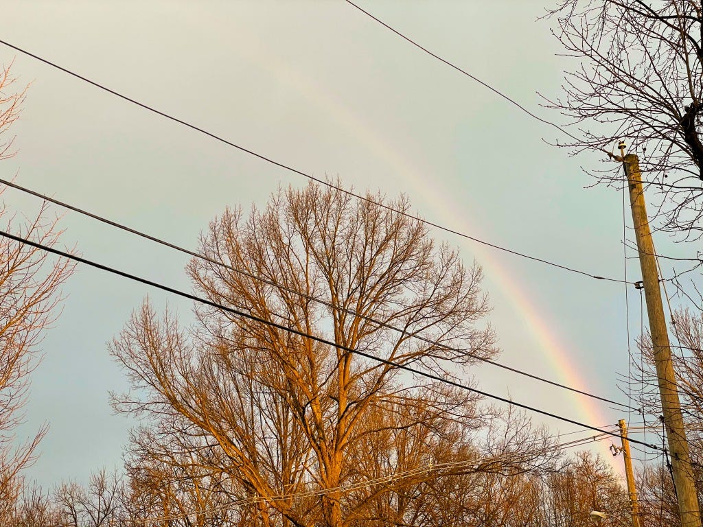 Enjoy the blessings and the moments when they come...that’s what I am hearing. Today has largely been a grey and rainy day but there was a moment this morning when the sun came out around 8a. It could not have been more than about 5 minutes but I poked my head outside and saw a full rainbow, stretching across the sky. It was stunning. Rather than grabbing my camera, I got my wife who was just waking up but in the 30 seconds or so that it was for when she came out to see, this was what was left. We were able to share that moment of blessing and beauty as our day started. Enjoy the moments when they come, soak them in, rejoice in them, hold to them, share them, take them in with others. That’s what I hear today.