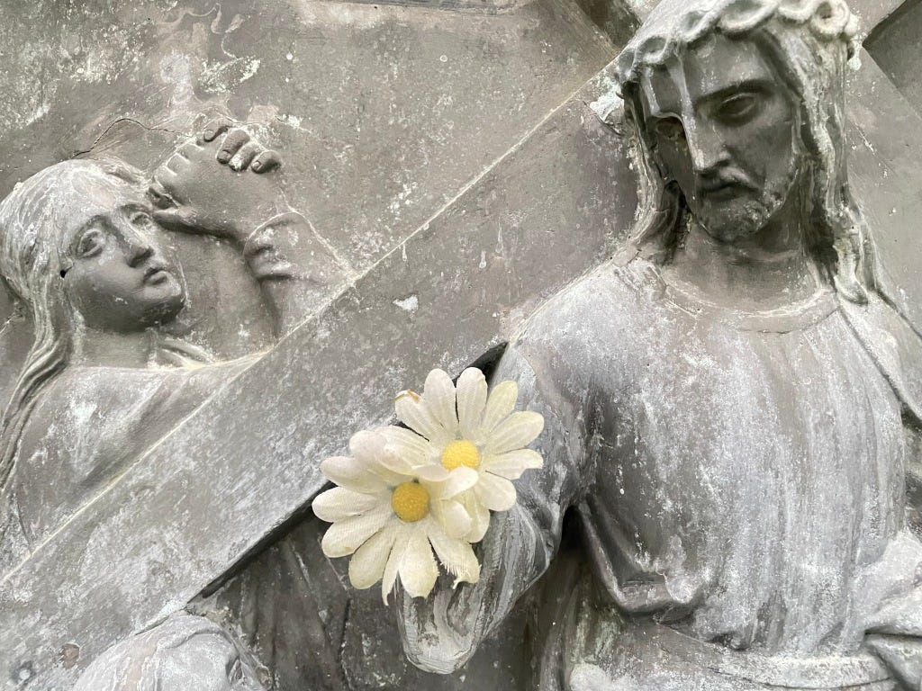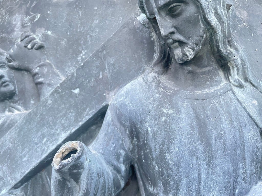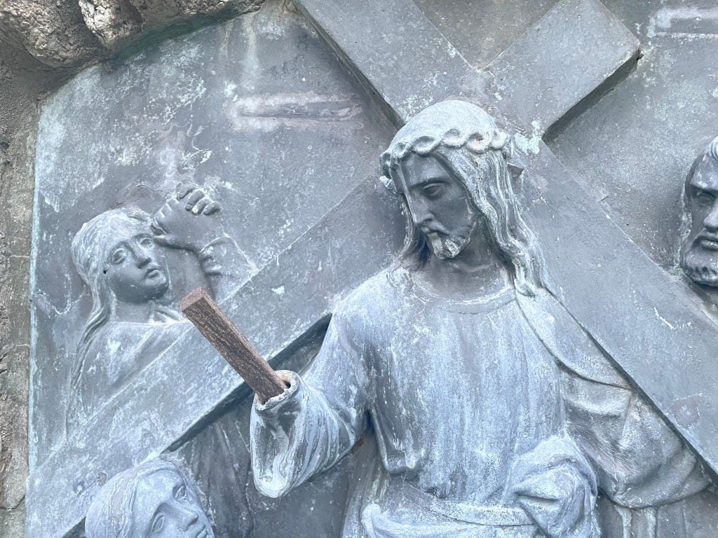 A few days ago I was walking through an outdoor Station of the Cross and noticed something strange. On the 8th station (The women of Jerusalem mourn for Jesus), I noticed something strange. Someone had stuck a stick in a spot where the sculpted hand of Jesus used to be.