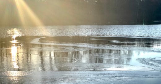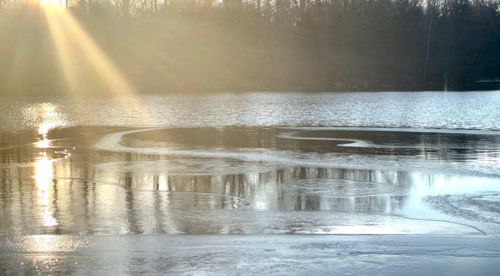 At first, I was mesmerized by the patterns in the lake. Some areas where the water was freezing over, others where the water seemed to be still, others where it was moving ever so gently. All in my immediate field of view. How could there be all these different ways of movement at the same time? So I pulled out my phone and tried to capture these movements with the video below. But as I started to record, I saw something through the lens of the camera that I didn’t see outside it - the rays of the sun shining in from the side shining down onto the waters. It might have been some oils on the camera lens that created it but it didn’t matter. Through the lens yesterday morning, I saw an additional beauty I would not have otherwise. What it spoke to me was the light and presence of the One who underlies all beauty, wonder, and joy.