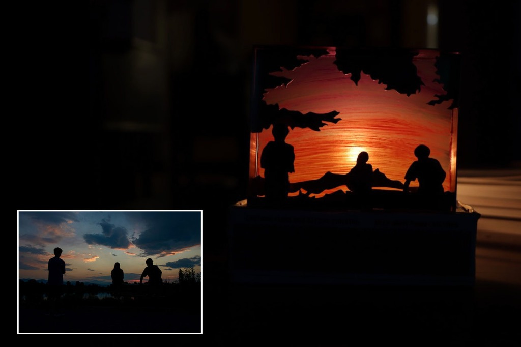 One of the most beautiful Christmas gifts I received this year was from my daughter who made me a glass and metal piece (larger part of the photo) that she patterned after a photo I took of her and her siblings taking in a Colorado sunset this summer (inset). The gift is so her and it is also so me as well. I love it.