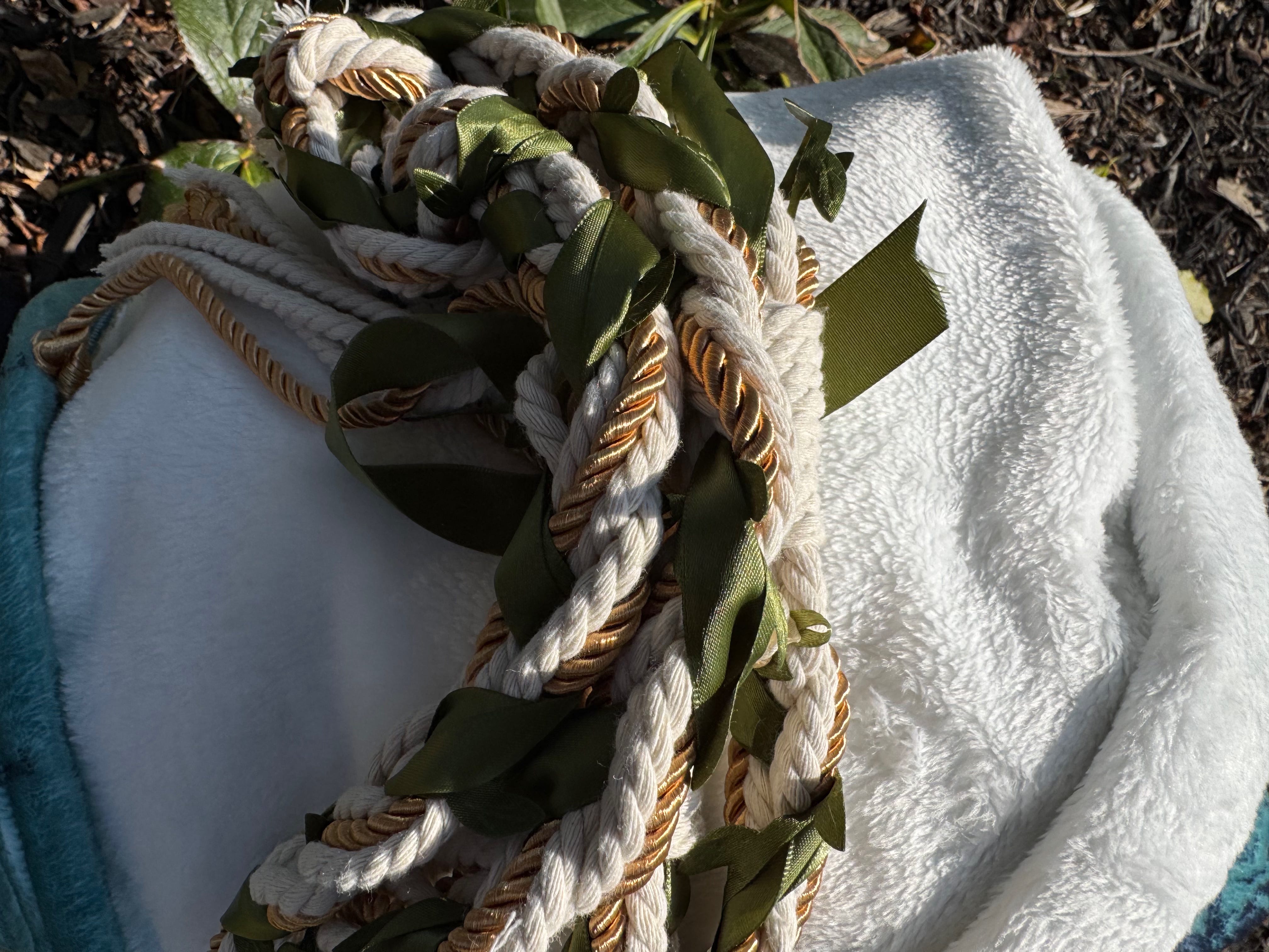 This also reflects the same truth shared around the trees. This new couple is bound together in a way different than they were before. But I love the braided cord that was used because it isn’t just a single strand but a series of separate braided cords (each made up of multiples) and also interwoven with leaves. So not only is the tree imagery there but also the commitment that this couple made to one another and the spoken commitments that everyone at the ceremony made to this couple as well. All of them rooted and tied in with one another.