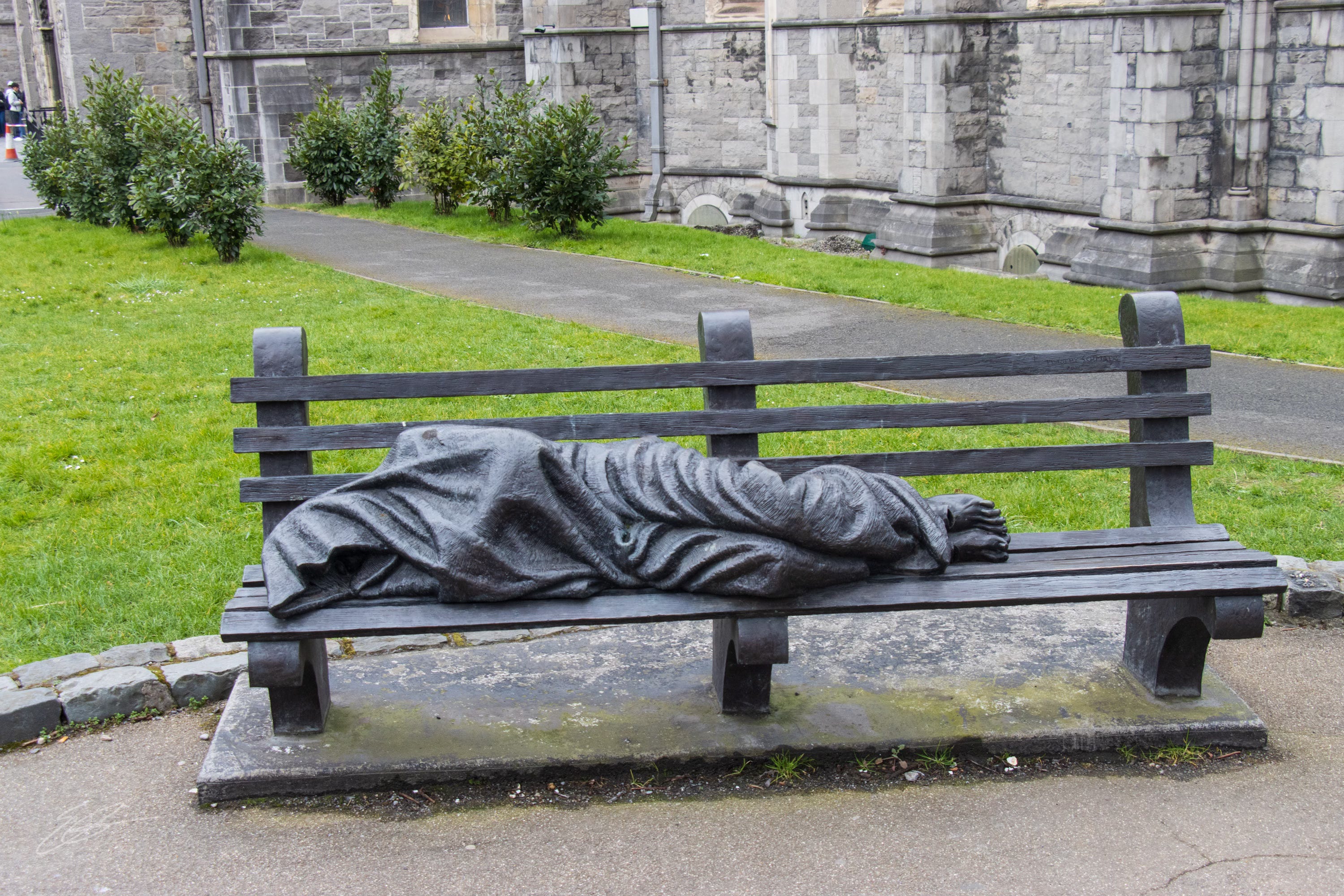 Entering the grounds of the cathedral is a powerful sculpture of Jesus which depicts him as a homeless person on a bench.