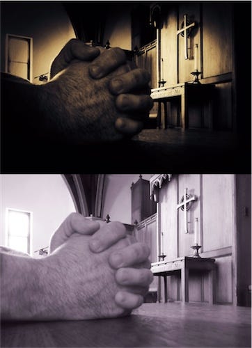 This Psalm is a study in painful contrast. You have some of the most raw words about wrestling with God’s presence (or feeling a lack thereof) and then words proclaiming faith and trust. I thought about how these words come from the same place but reflect different circumstances / colors around them. One is dark and foreboding and the other is hopeful and looking above. I took both these pictures this morning and took the same picture and edited them to show how the same place can look so different. One place dark and scary, the other peaceful and warm. Both images reflect a posture of prayer with the cross before with central place. But they feel different. Which part of Psalm 22 speaks more to you today? To me, I feel in both places today with circumstances in my life as well as in the lives of others. May my words ultimately end on “saying that the Lord has done it.”