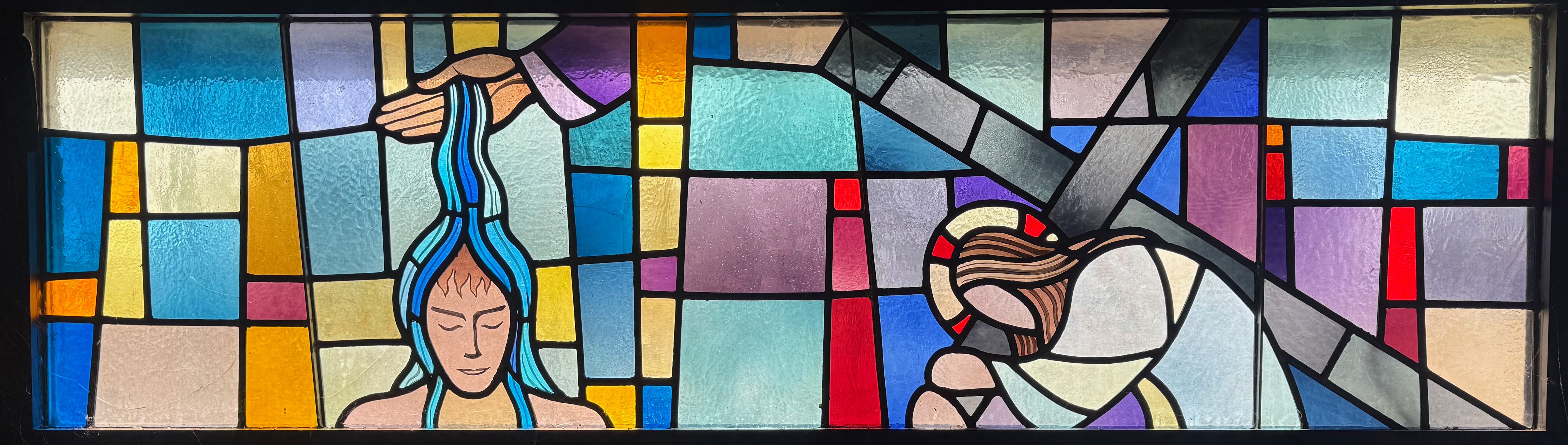 A reflection shared at ResoundingJoy Church on February 22, 2026 centering on Mark 1:1-11 and Matthew 28:19-20. It focuses on the baptism portion of this stained glass in the sanctuary and on the baptism of Jesus.