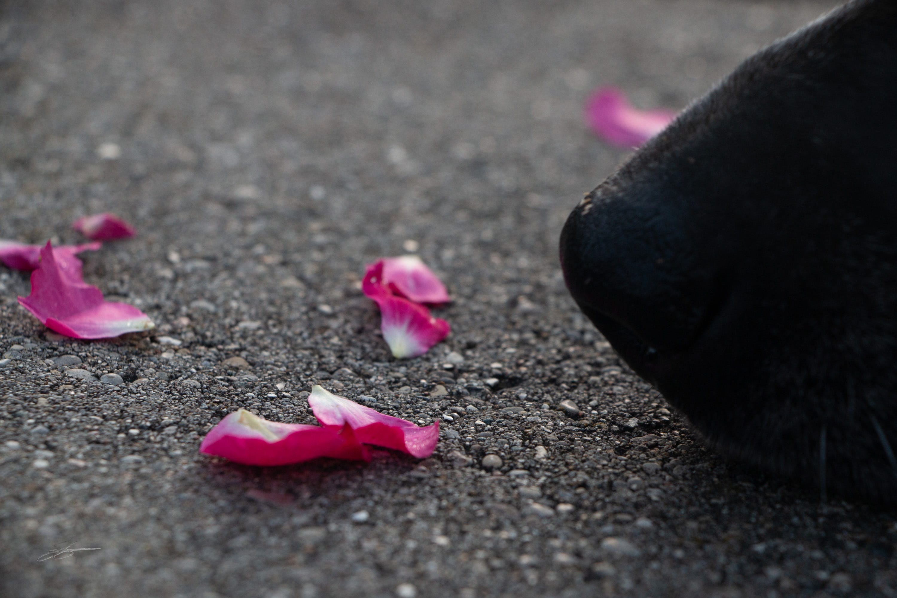 The other morning as I was out with my dog, we walked by a house in our neighborhood who has one of those low walls along the side of the yard. Someone had left a pile of petals on the wall. I took a few shots of just the petals on the stone as I thought it was a beautiful contrast and then my dog came over and started sniffing at them. But she wasn’t just sniffing, but she was gently blowing them - she would blow out with her nose and see the petals move around and then she’d move a bit and do it again. She did this for a few minutes - very gently but deliberately. That was a moment to just take in - to enjoy what my dog was doing, to see the fun she was having with it. To take it in.