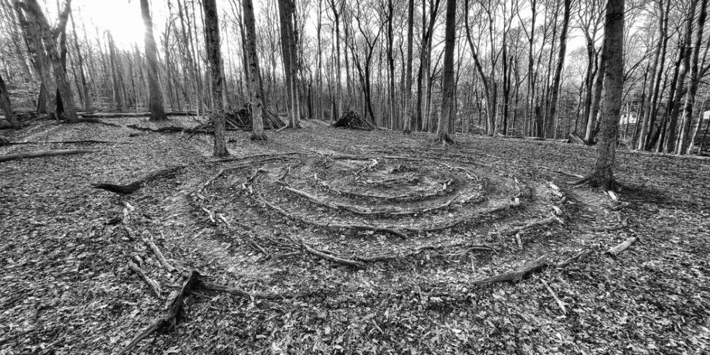 Nearly to the end of the week, the labyrinth today was the hardest to find and the roughest to walk. It was hidden off a path in a local park, created of just sticks that had fallen in the area and was a pattern similar to Friday's. To me, it felt like it captured the sense of this "in-between" day. In between the events of Thursday and Friday, sitting with the grief of the death of Jesus, and hopeful of what was to come with Easter tomorrow.