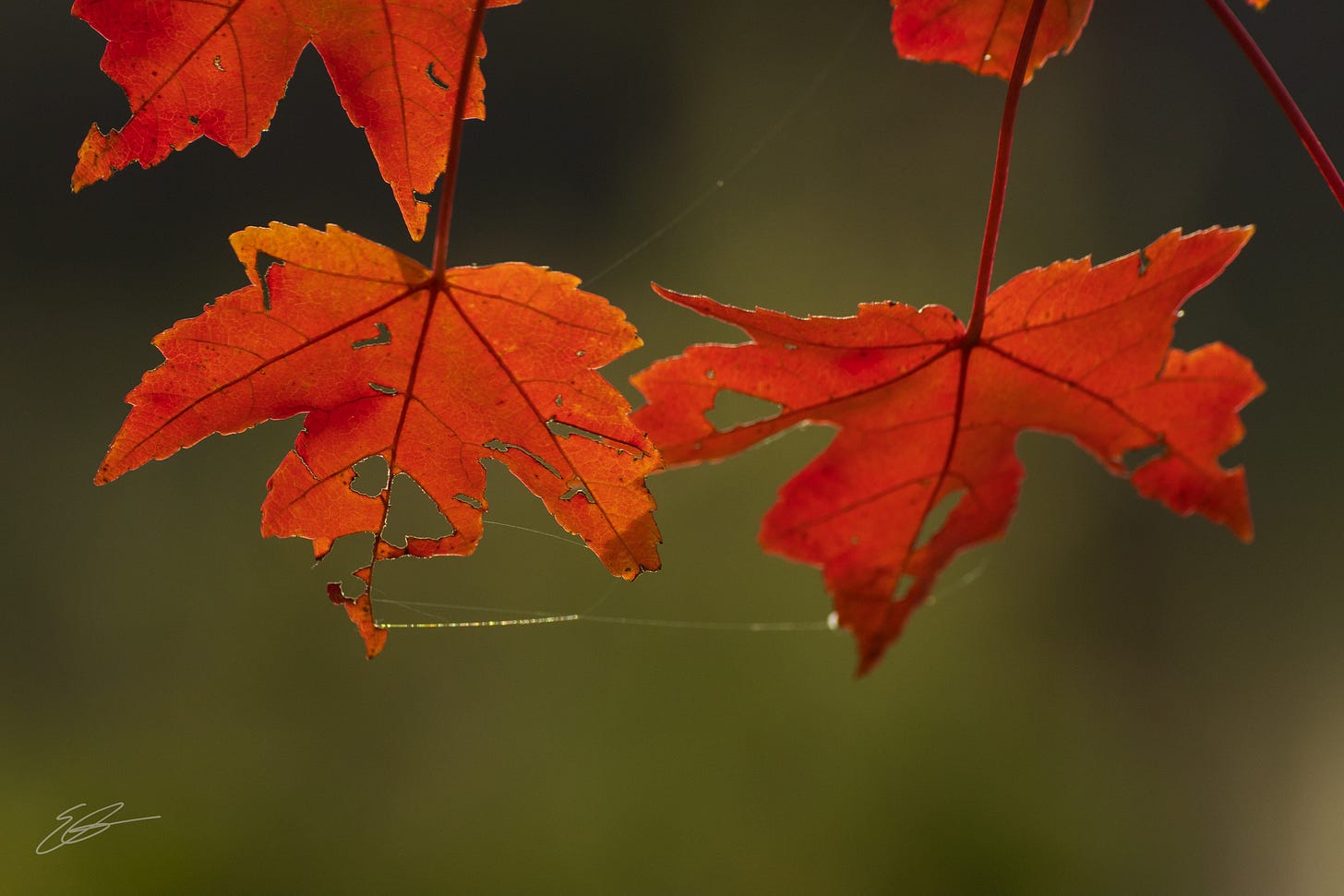 I’m walking with Scout (that should be the center of the “Ed Bingo” card) last evening and soaking in the beautiful autumn colors we have right now and was specifically focused on one tree and the vibrancy of its leaves. As I was photographing one of the leaves on one side of the tree, I noticed a tiny glint on the other side of the tree’s leaves. As I looked closer I saw this.