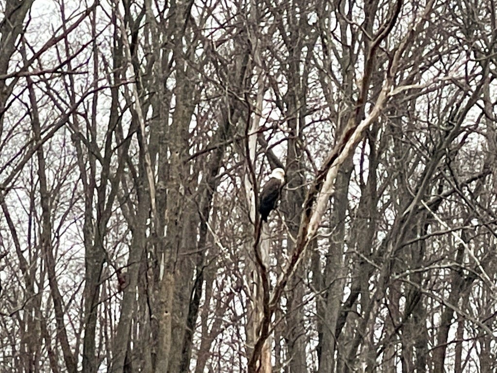 I thought yesterday was going to be an “ordinary” January morning. It was the typical grey, cloudy morning that we have in Cincinnati in January and so I decided not to bring my camera with me on my walk. And it went exactly that way until a woman pulled over in her minivan and told me to look for the bald eagle up ahead. I had heard about eagles being at Winton Woods but hadn’t seen any as yet. So, I went to where she told me and sure enough there was the eagle and I cursed the fact that I chose to leave my camera in the car and all I had was my phone. So, what had been an ordinary morning changed quite a bit when seeing that majestic animal. The only other time I remember seeing a bald eagle out in nature was when we were in Alaska 10 years ago.