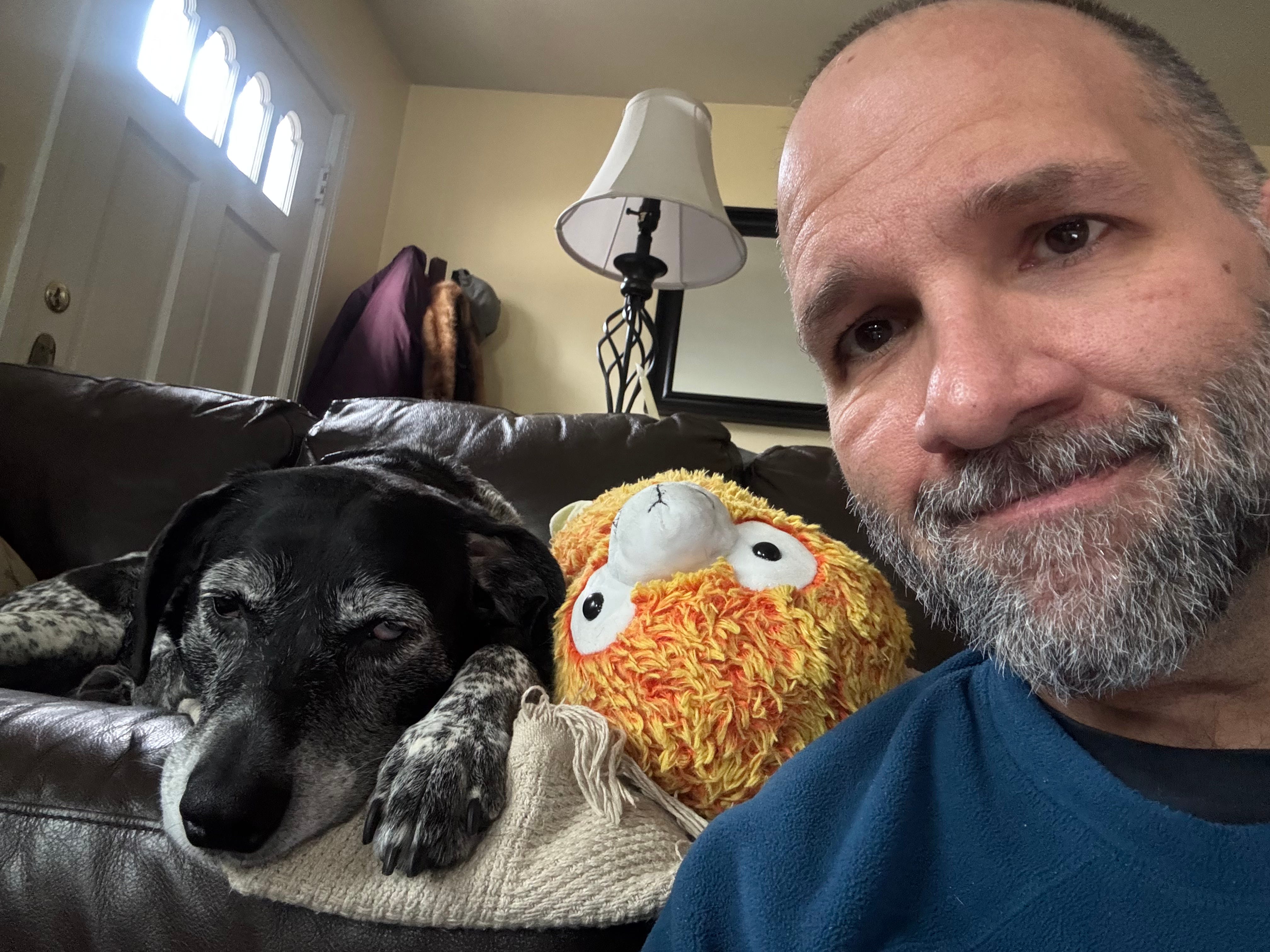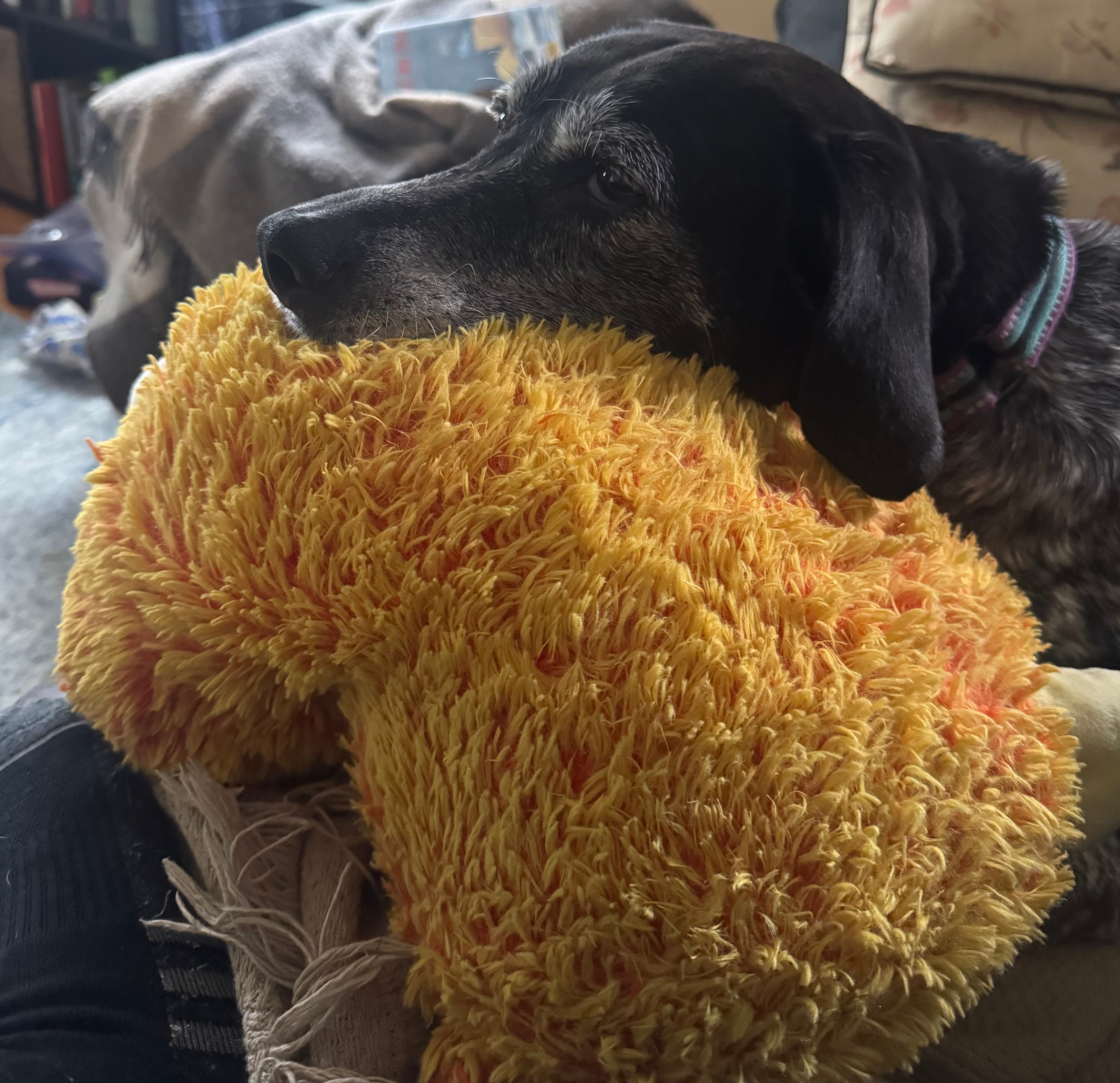 And then in the afternoon, I had been sitting with Scout on the couch doing some reading and sermon work. She was snoozing away with some gentle snores and some periodic twitches of her legs (dreams?). My watch reminded me it was time to get up to stand and so I walked into the kitchen and walked around a bit and then sat down at the kitchen counter to do a bit of writing (the above post actually). As I was starting to write, I heard Scout get up and go walking around and shortly thereafter I looked down and she had brought her plush llama out to me. I gave her a head scratch and then she walked back into the living room and I heard her get up on the couch. When I looked in, she had laid her head on the llama in the cutest possible way. So I wandered back in and sat back down and she then curled up and went back to sleep. Dogs know how to communicate what they want.