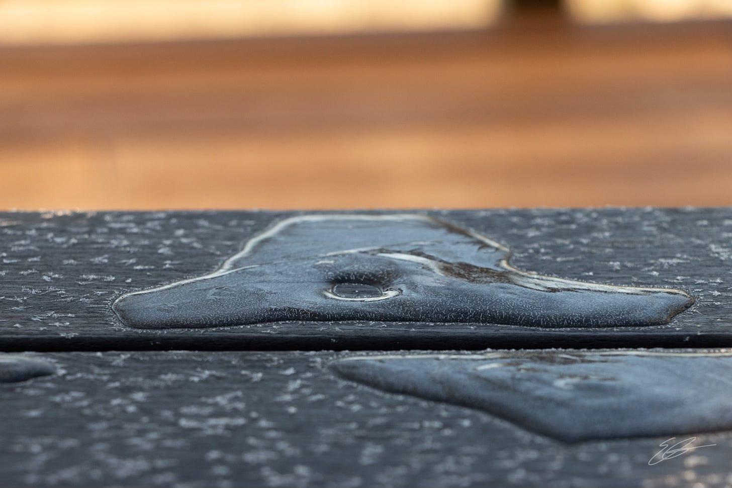 The next morning, while it was still below freezing, I was curious whether the “hole” was still there. Sure enough it was, but this time frozen with nearly the exact same shape. Camera again came out. Click.