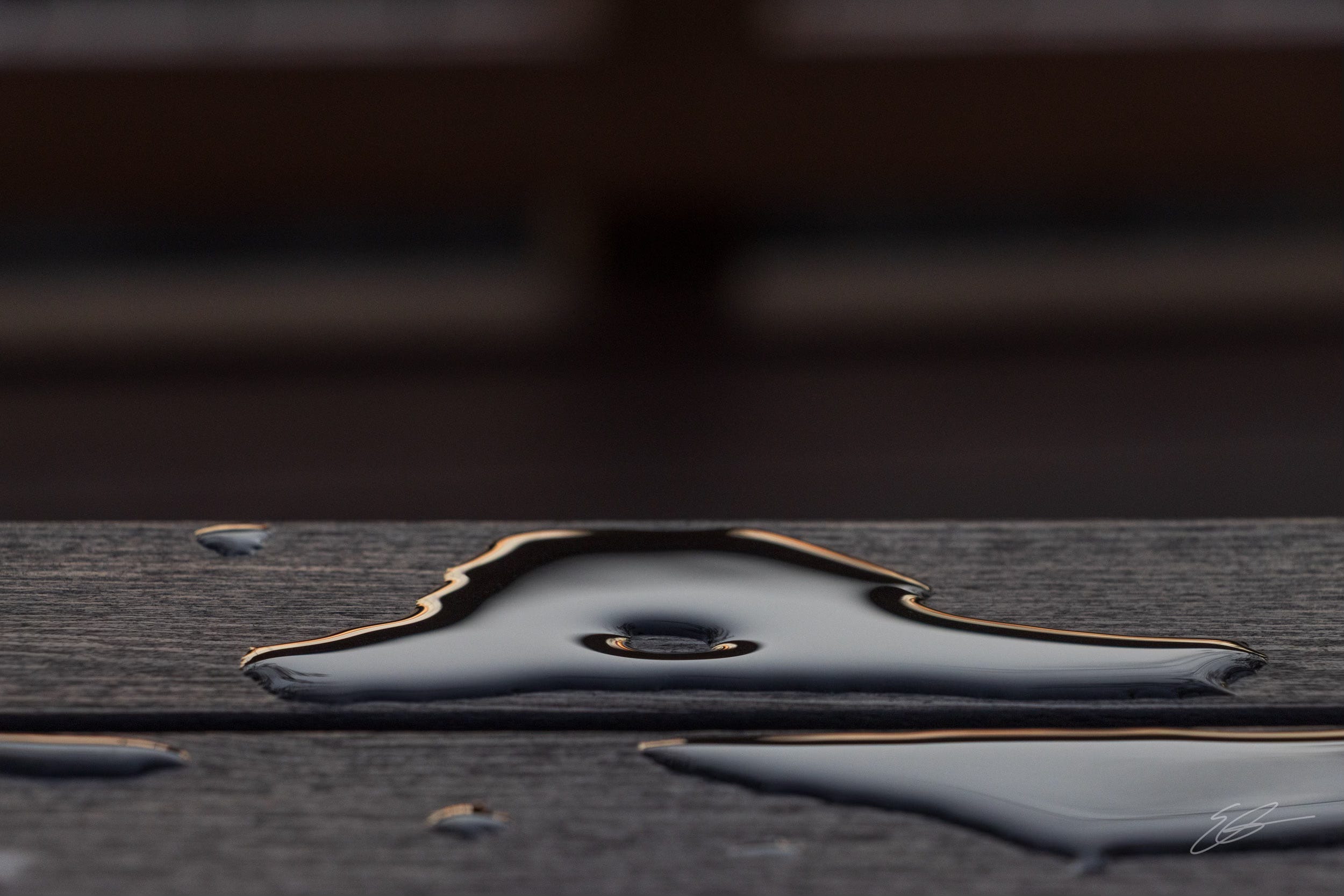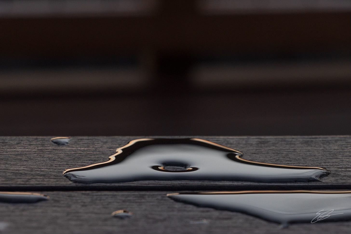 Sunday night, I wandered out onto the deck of the building where we were meeting and noticed this really unique water pattern on one of the tables. There was that “hole” in the middle of the water. I didn’t look too closely to figure out why but was fascinated simply by it being there. I also saw the sunset (the deck faced west) reflecting in the edges of the water. Camera came out. Click.