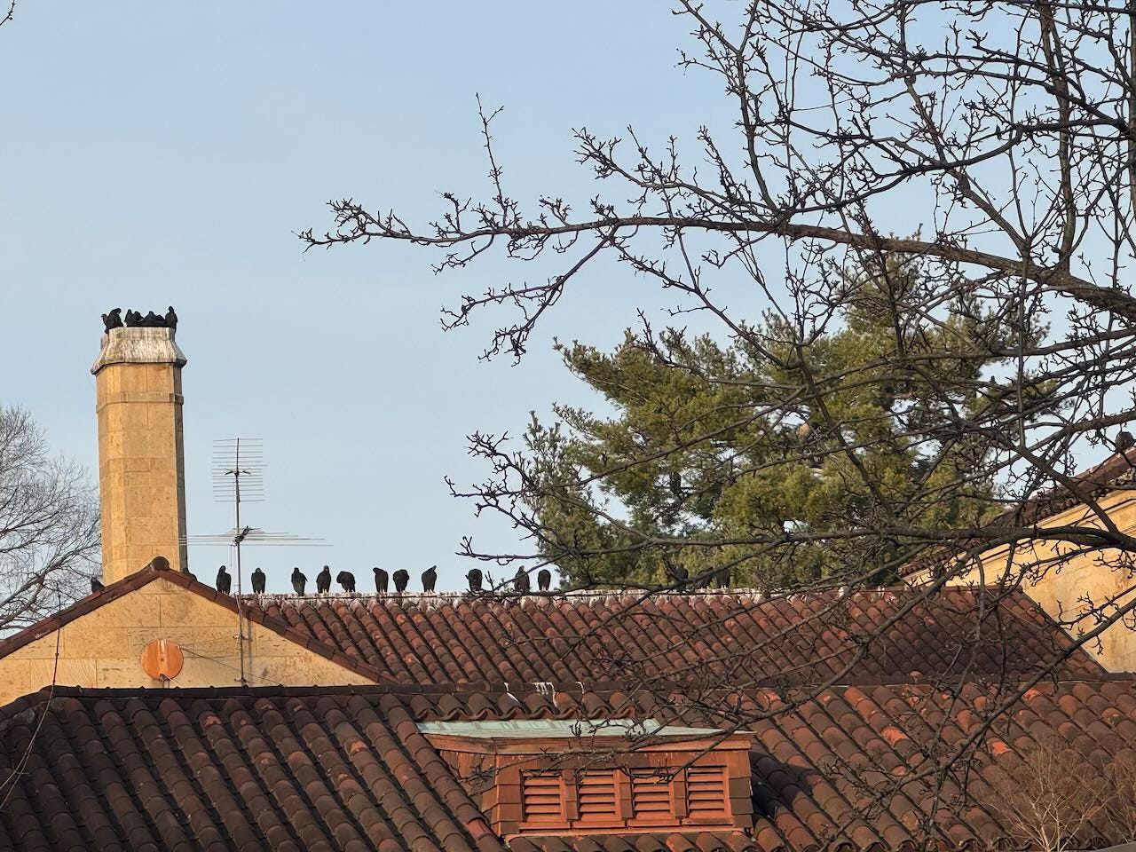 I first noticed this about a week ago during a major cold snap that we had here and I have included a video at the end of Scout’s initial reaction to the whole thing. But that time and others I’ve walked by, I noticed something really interesting. Periodically one of the vultures from the chimney flies down to the roof or over to the tree and another one takes its place on the chimney. And then a few moments later the same thing happens with other ones. I’m pretty sure if I stayed there longer, I’d keep seeing that pattern repeat itself over and over. Once one of the vultures is warm enough (I’m assuming that’s why they’re at the chimney - not sure what the inhaled exhaust is doing to them though) they move off so another one can warm up.