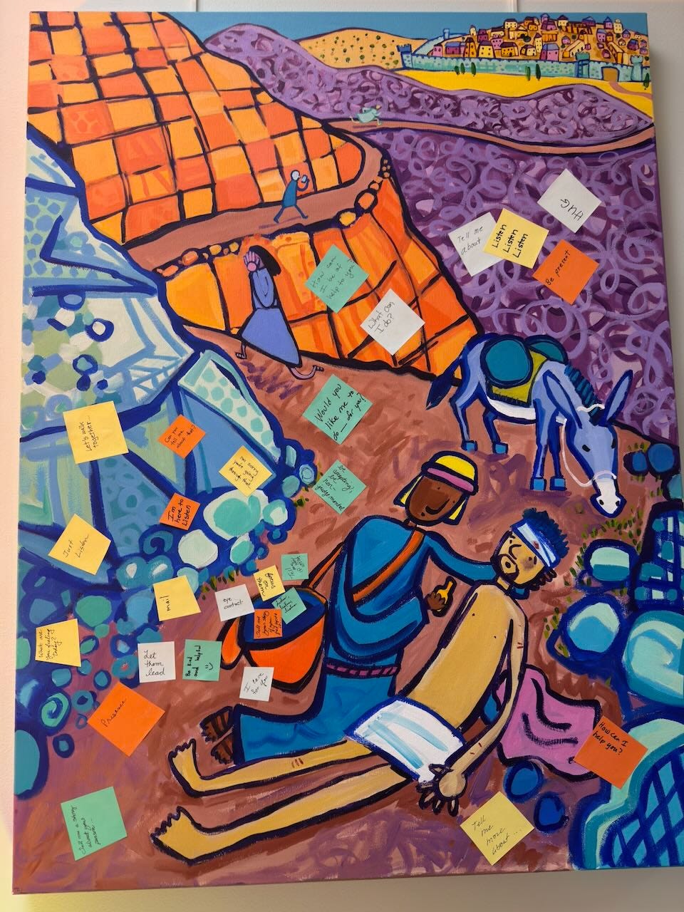 I was also at part of a conference in Grand Rapids, Michigan last week and the host church had this beautiful depiction of the Parable of the Good Samaritan. I was especially moved by two things. First, the post-it notes that were placed on it. Second, if you look closely, you’ll see one of the people who passed the injured man is walking looking down at his phone. A powerful message about how much we miss (and goodness knows I’m guilty of this) as we have our eyes down at that too-tempting tiny screen…